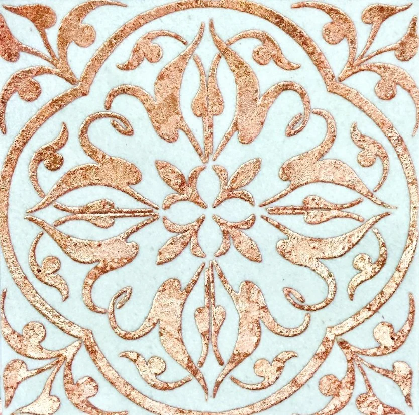 Our handmade Crema Luna limestone tiles offer a stunning blend of natural elegance and artistic craftsmanship. Each tile is etched with intricate patterns, bringing out the unique textures of the stone. The tiles are stained in a rich palette of grey, moss, black, light ochre, blues, confederate, and sienna, creating a harmonious blend of warm and cool tones. The delicate copper inlay adds a touch of luxury, highlighting the design with a subtle gleam. These tiles are perfect for adding sophistication and character to any space, blending timeless beauty with modern artistry.