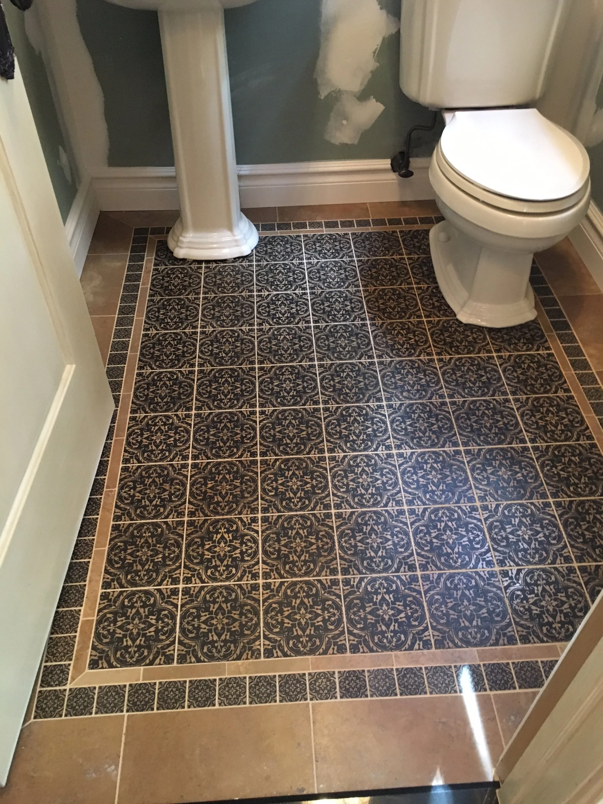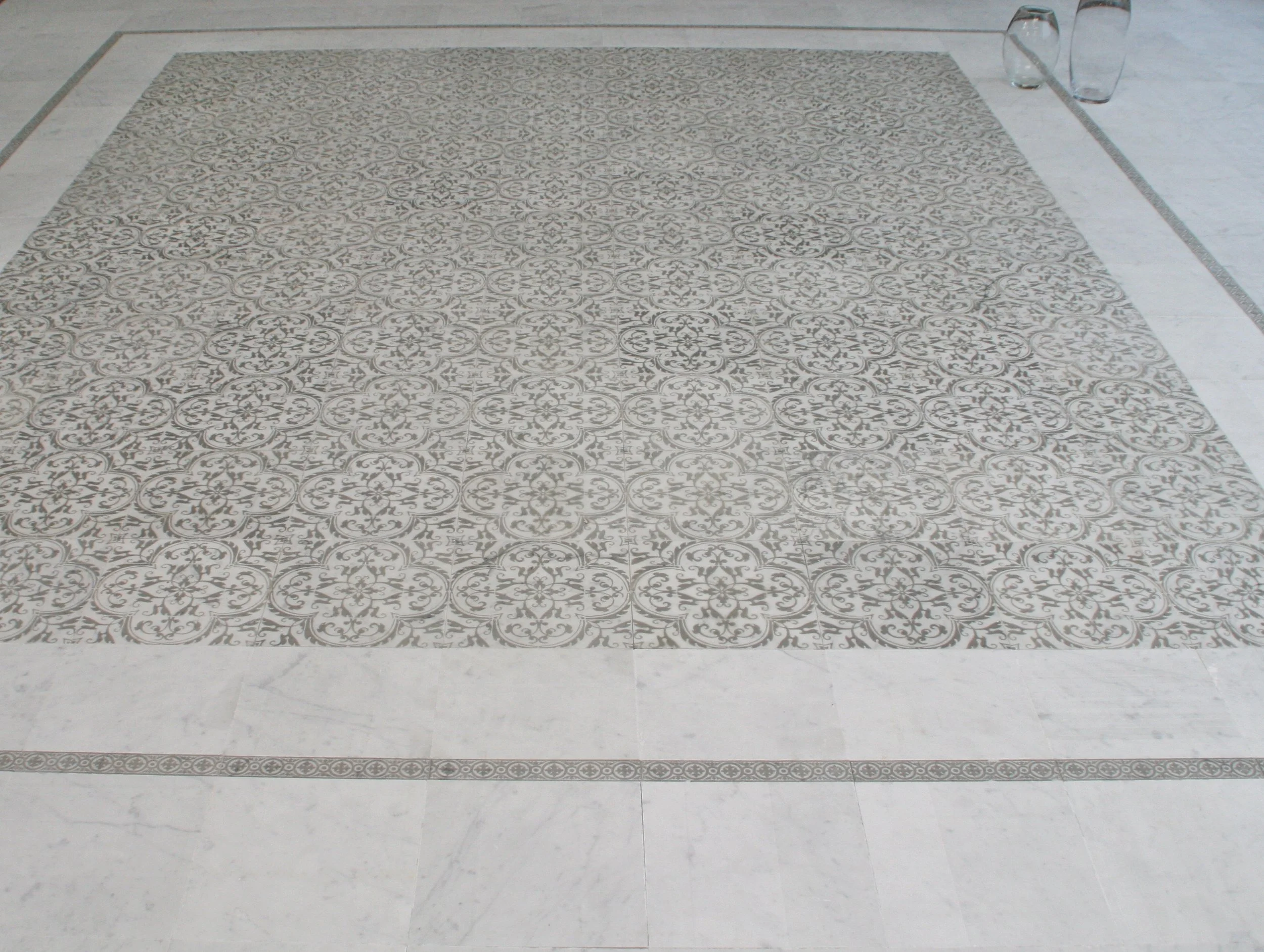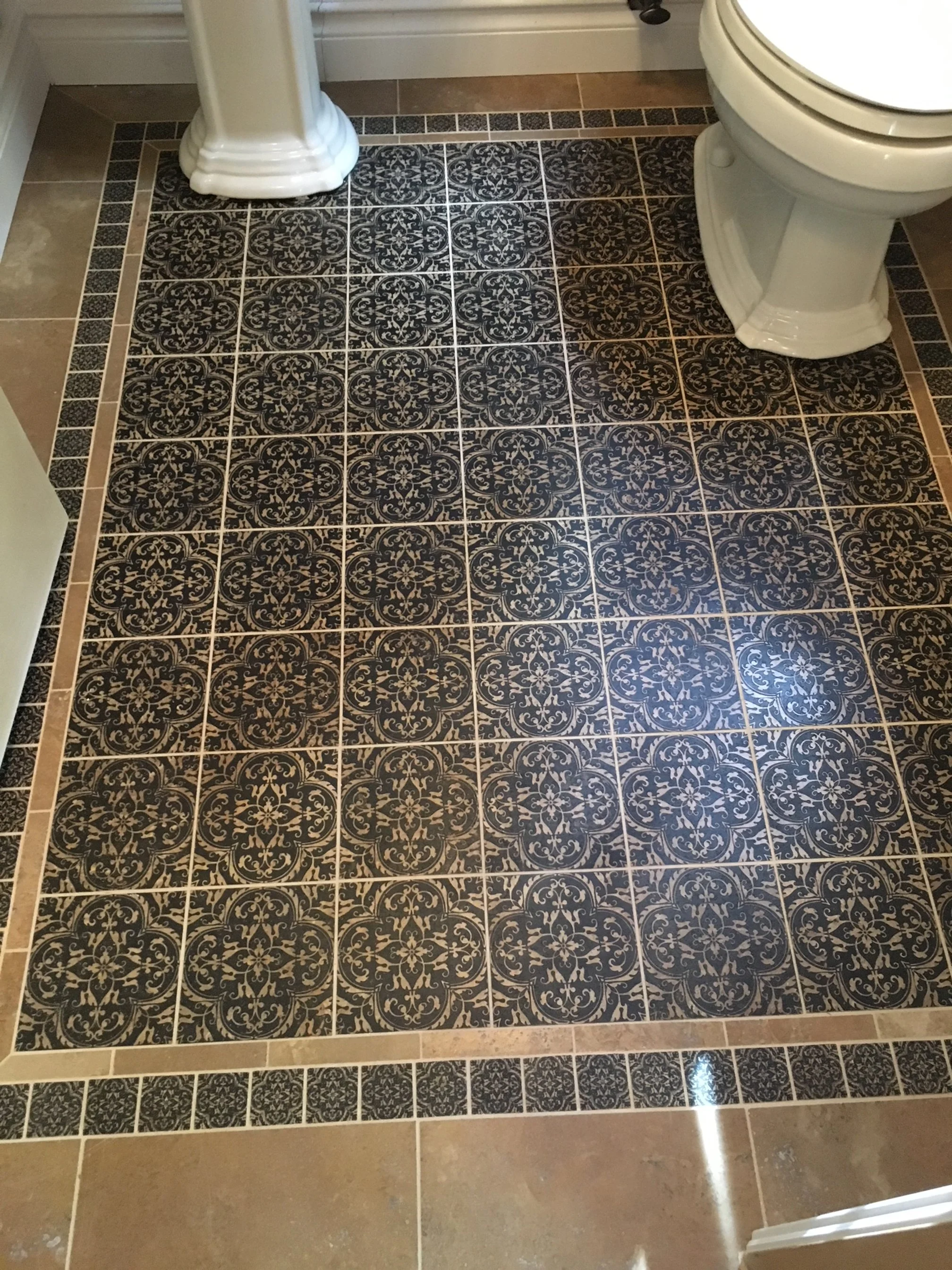 Intricately patterned beige floor tiles with decorative botticino border trim decos ( Classico tile and marble )
