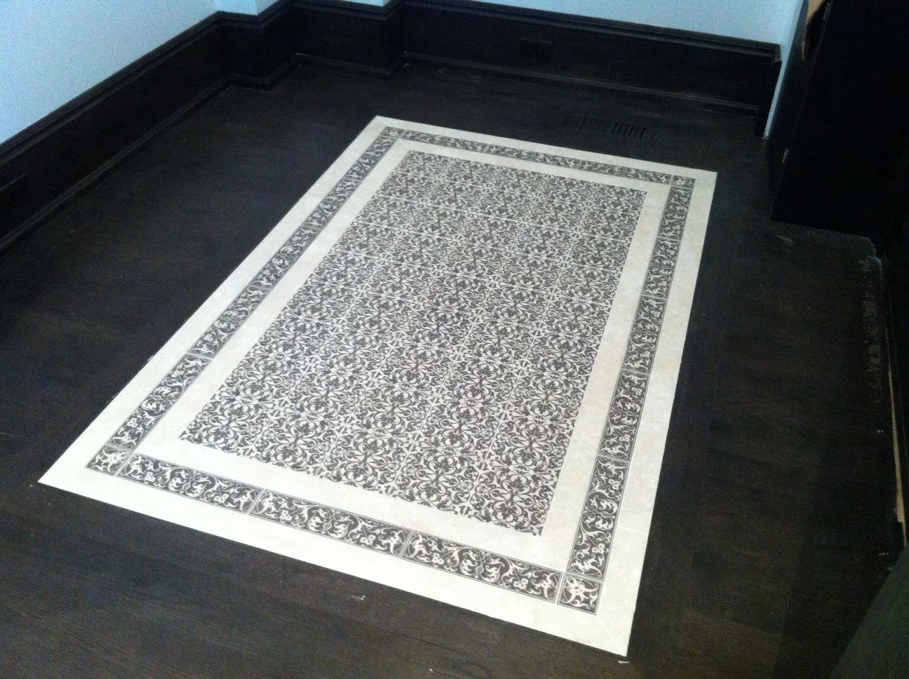 Fireplace custom pattern featured on Light Travertine with Chocolate stain